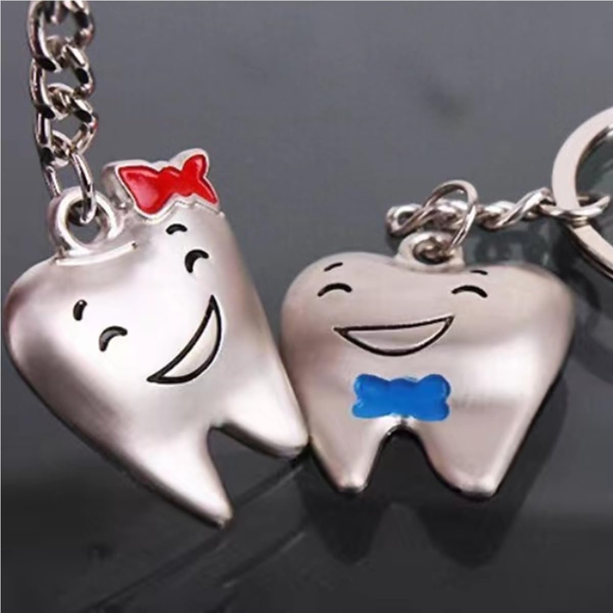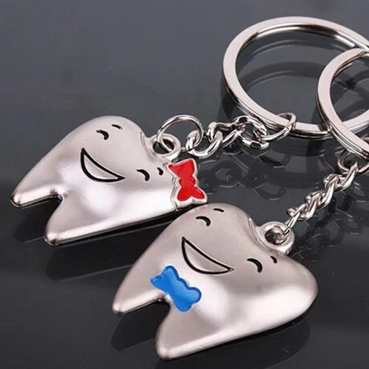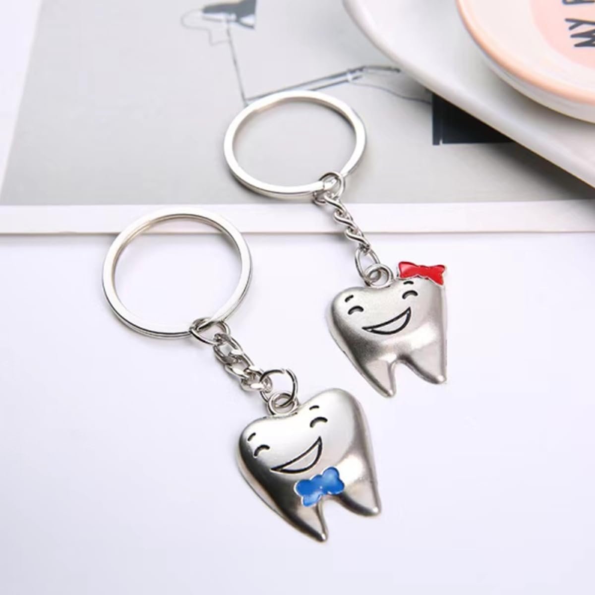 This adorable Tooth Couple Keychain Set features two smiling teeth with charming bow details Ñ one with a red bow and the other with blue. Made from durable metal, these cute characters bring fun to your keys, bags, or dental accessories. A perfect gift for dentists, dental students, clinic staff, or couples in dentistry.