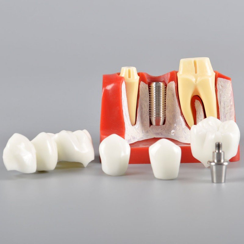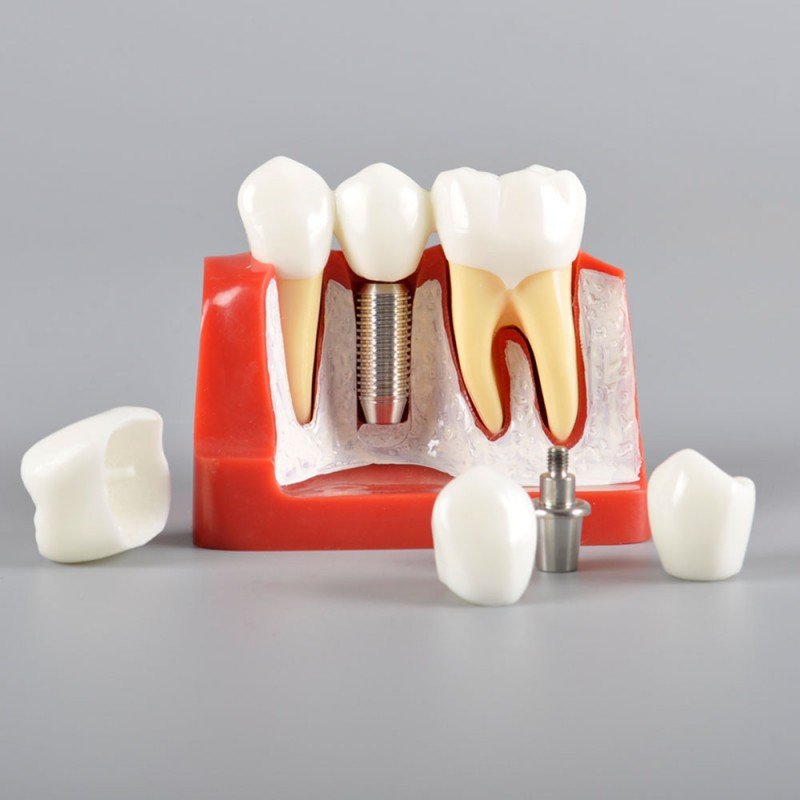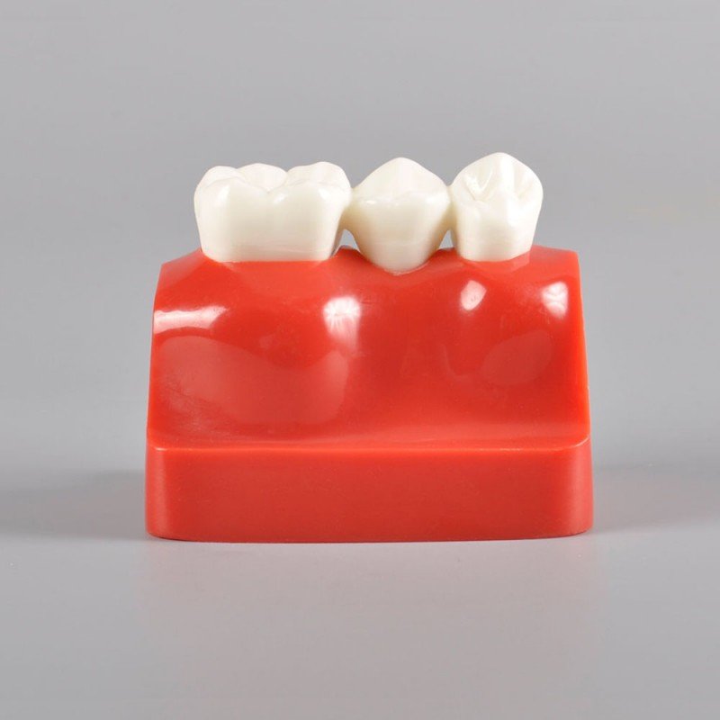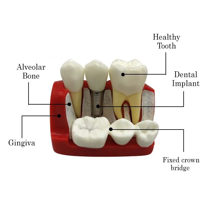 Crafted using durable resin material, this compact model showcases a three-unit scenario: two healthy teeth and one missing tooth, with one version fitted with a dental bridge, and the other with a single-tooth implant. This direct comparison makes it easier for patients to visualize the difference in treatment, understand the importance of preserving adjacent teeth, and make informed decisions about their oral health.